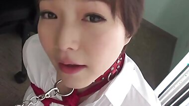 Tanned Japanese Latex Slave Gagged and Chocked by Master