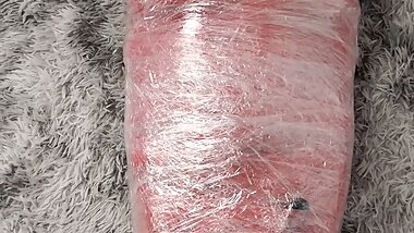 "NANA Mummified with red plastic tape and then played with for orgasms"
